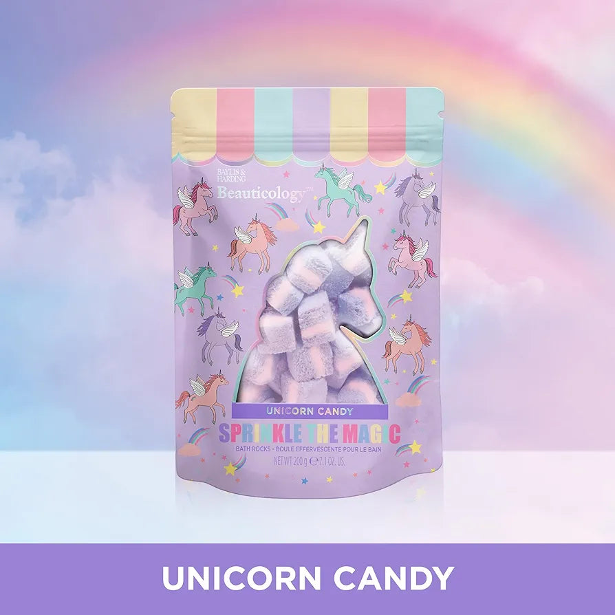 A magical blend of unicorn sparkle, unicorn candy fragrance and gentle cleansing will have you imagining in a tub filled with unicorns and rainbows. Your bath ROCKS. Mermaid tails and unicorn horns, the glisten of iridescent bottles, positive sentiments and sweet dreamlike scents, this enchanted bathing collection is sprinkled with sweet and fruity fragrances that bring a sense of magic to taking a shower, scrubbing those hands or soaking in a tub.