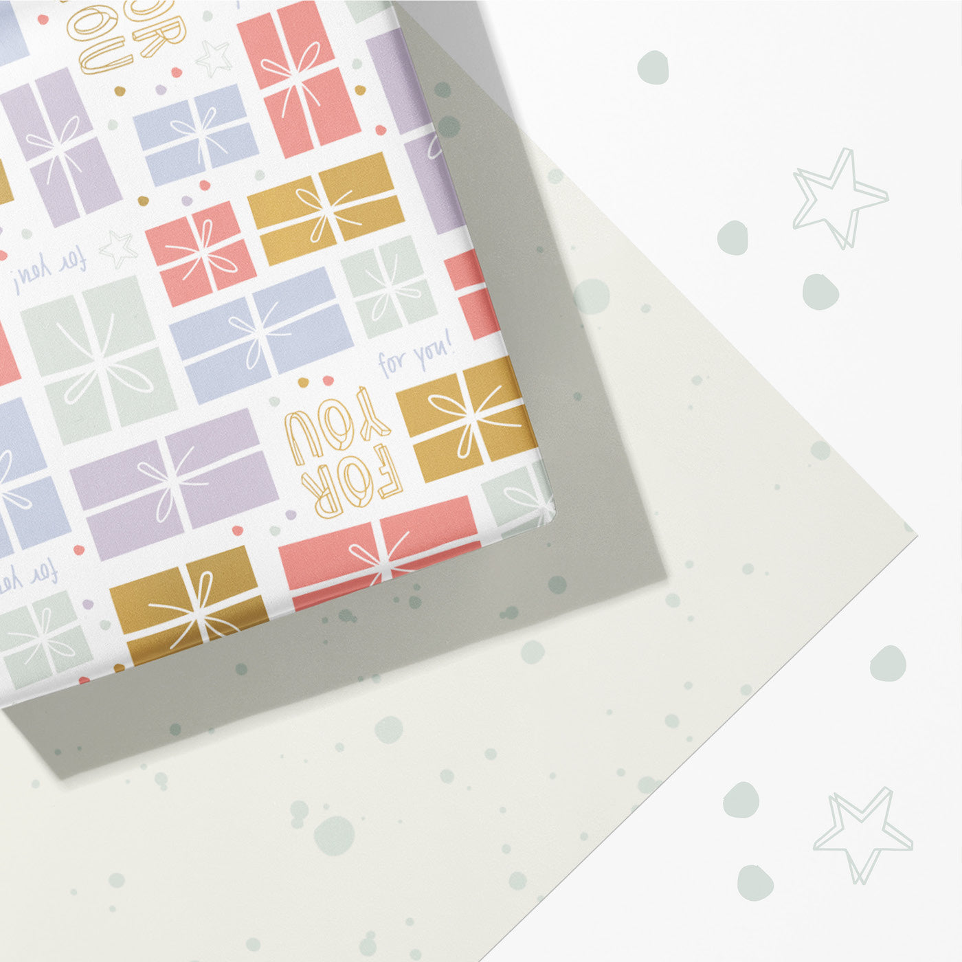 This print with cheerful parcels is perfect for any occasion and fun for all ages. With a touch of neon (in the colorful) and gold, this design is super festive.